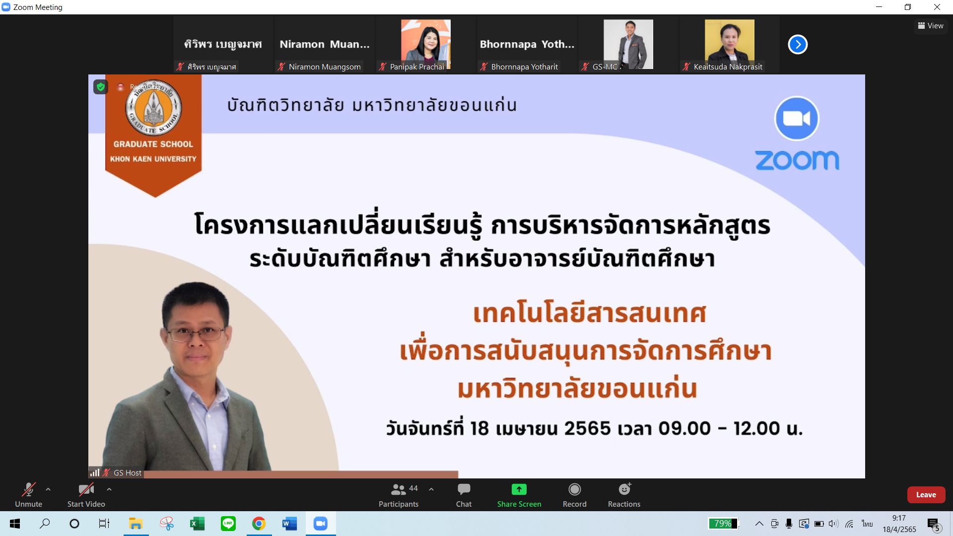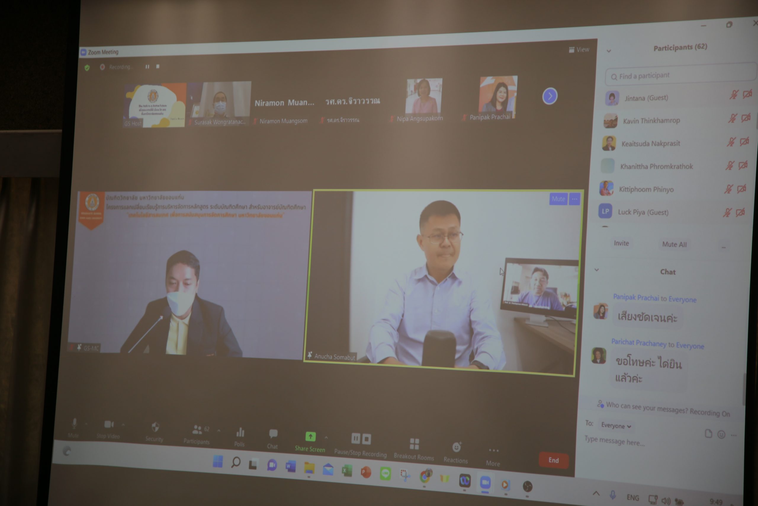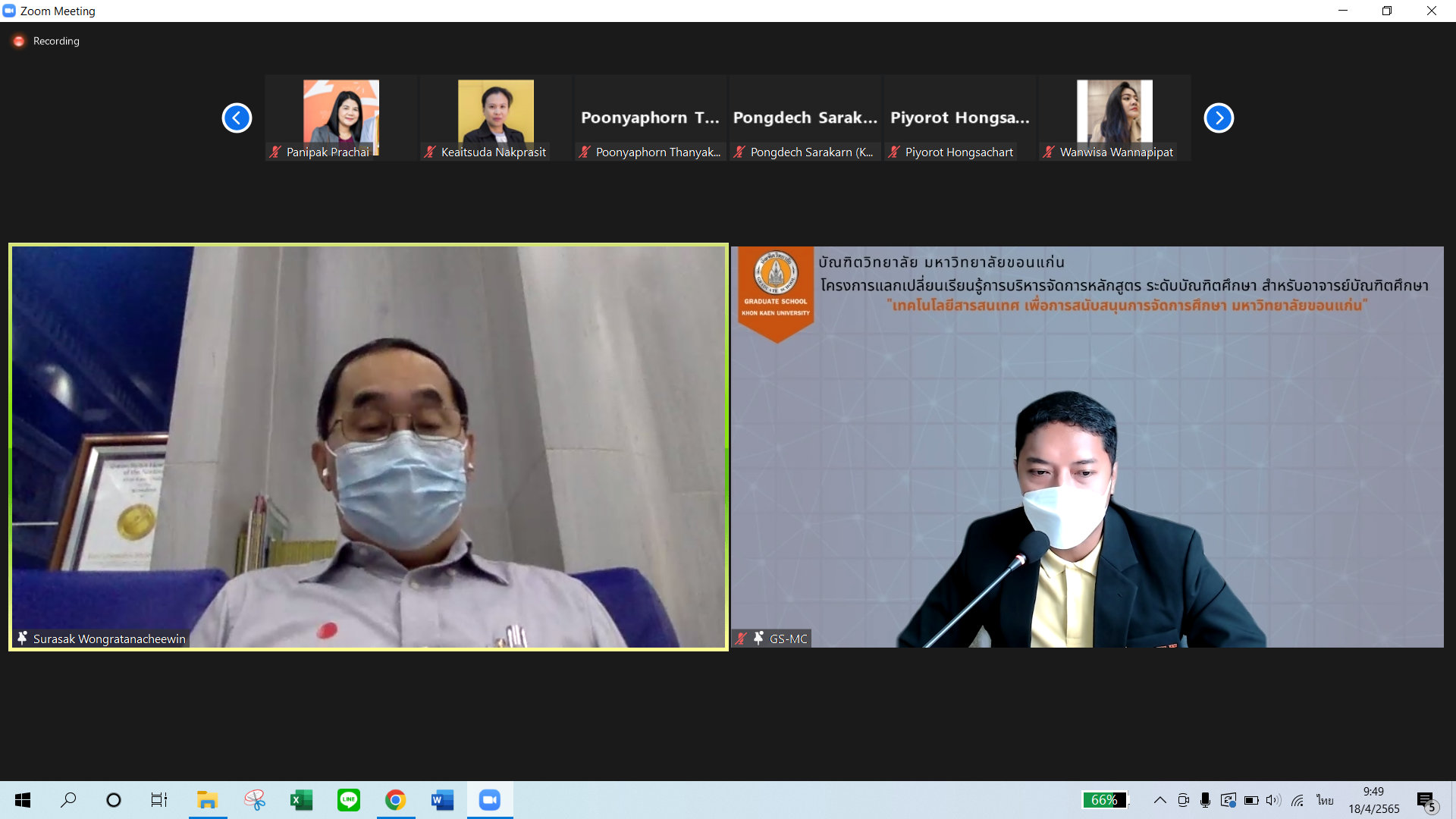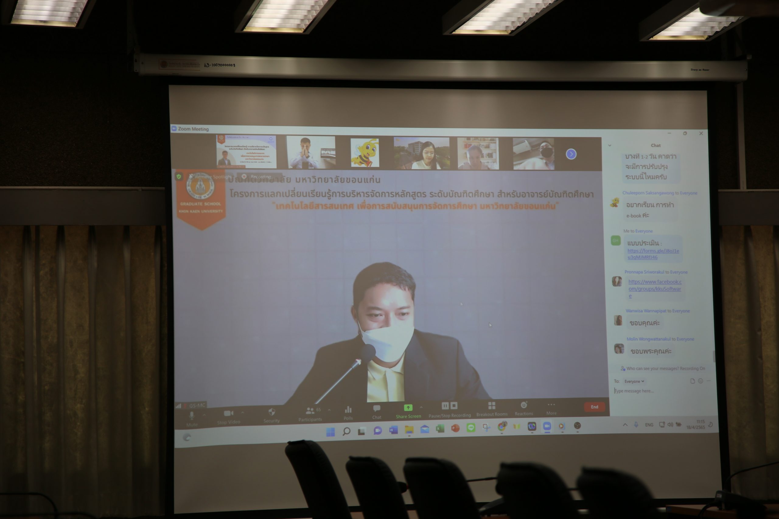 บัณฑิตวิทยาลัย มหาวิทยาลัยขอนแก่น จัดโครงการแลกเปลี่ยนเรียนรู้ การบริหารจัดการหลักสูตร ระดับบัณฑิตศึกษา สำหรับอาจารย์บัณฑิตศึกษา วันจันทร์ที่ 18 เมษายน 2565 เวลา 09.00 – 12.00 น. ผ่านระบบออนไลน์ Zoom ศ.ดร. สุรศักดิ์ วงศ์รัตนชีวิน คณบดีบัณฑิตวิทยาลัย กล่าวเปิดงาน วิทยากรโดย ผศ.ดร.อนุชา โสมาบุตร รักษาการผู้อำนวยการศูนย์นวัตกรรมการเรียนการสอน มหาวิทยาลัยขอนแก่น บรรยายเรื่อง เทคโนโลยีสารสนเทศ เพื่อการสนับสนุนการจัดการศึกษา มหาวิทยาลัยขอนแก่น เพื่อพัฒนาหลักสูตรและปรับรูปแบบการจัดการเรียนการสอนให้ทันตามความต้องการของตลาดงานและการพัฒนาประเทศ เพิ่มขีดความสามารถในการแข่งขัน พร้อมทั้งแลกเปลี่ยนเรียนรู้ ปัญหาและแนวทางแก้ไขปัญหาในเรื่องการบริหารจัดการศึกษาระดับบัณฑิตศึกษา เพื่อให้การบริหารจัดการศึกษาระดับบัณฑิตศึกษามีประสิทธิภาพและประสิทธิผลมากยิ่งขึ้น