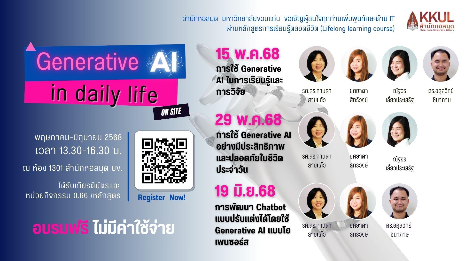 สมัครหรือยัง ? หลักสูตรการเรียนรู้ตลอดชีวิต (Lifelong learning course) กับหลักสูตรที่ 3 Generative AI in daily live 08/04/2025 10:10 น.