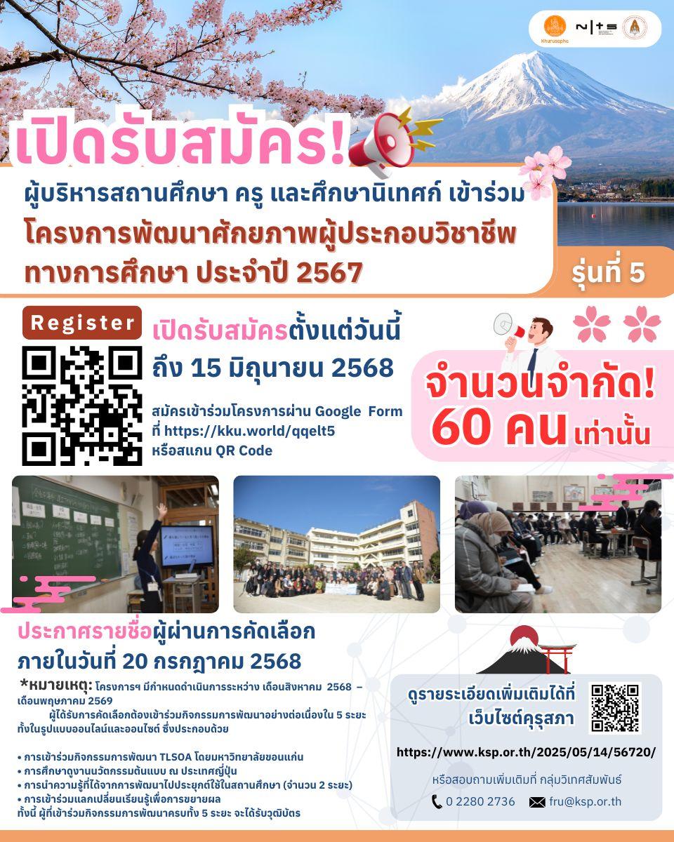 เปิดรับสมัครสถานศึกษาทั่วประเทศ เข้าร่วมโครงการพัฒนาศักยภาพผู้ประกอบวิชาชีพทางการศึกษา ประจำปี 2567 (รุ่นที่ 5) จำนวน 60 คน ระหว่างวันที่ 15 พฤษภาคม – 15 มิถุนายน 2568 16/05/2025 9:40 น.